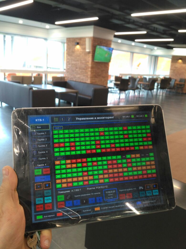 TV-sets are equipped with a DATA port, and control is realized via it. Two AMX controllers monitor and control TV-sets. The whole system is controlled from iPad. Engineers managed to unite 2 AMX controllers and to distribute the load.